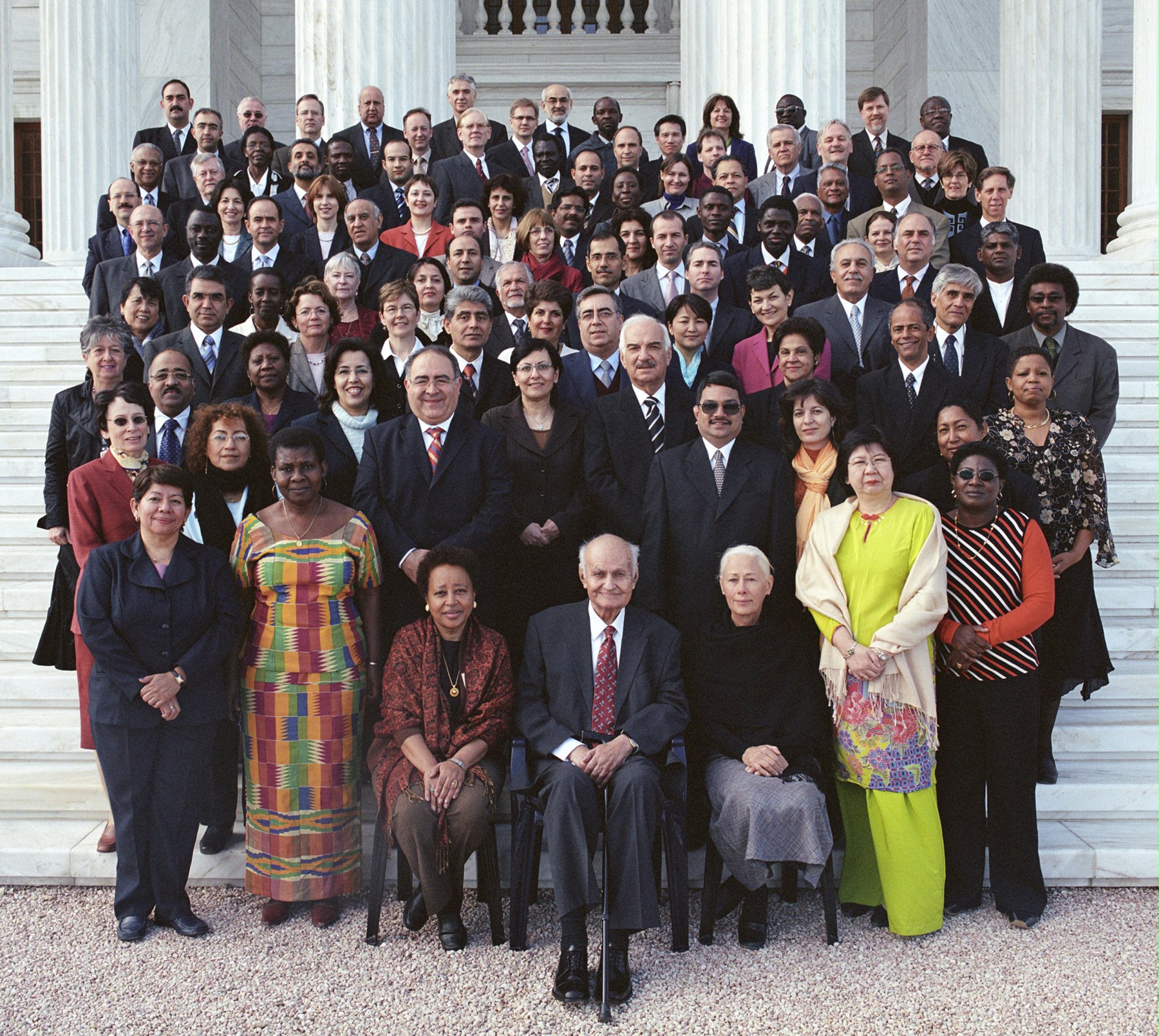 Gathered on the steps of the Seat of the Universal House of Justice on Mount Carmel, Haifa, Israel in 2005 are members of the Continental Boards of Counsellors together with members of the Universal House of Justice, the International Teaching Centre, and, at front, centre, the Hand of the Cause of God Dr. Ali-Muhammad Varqa.